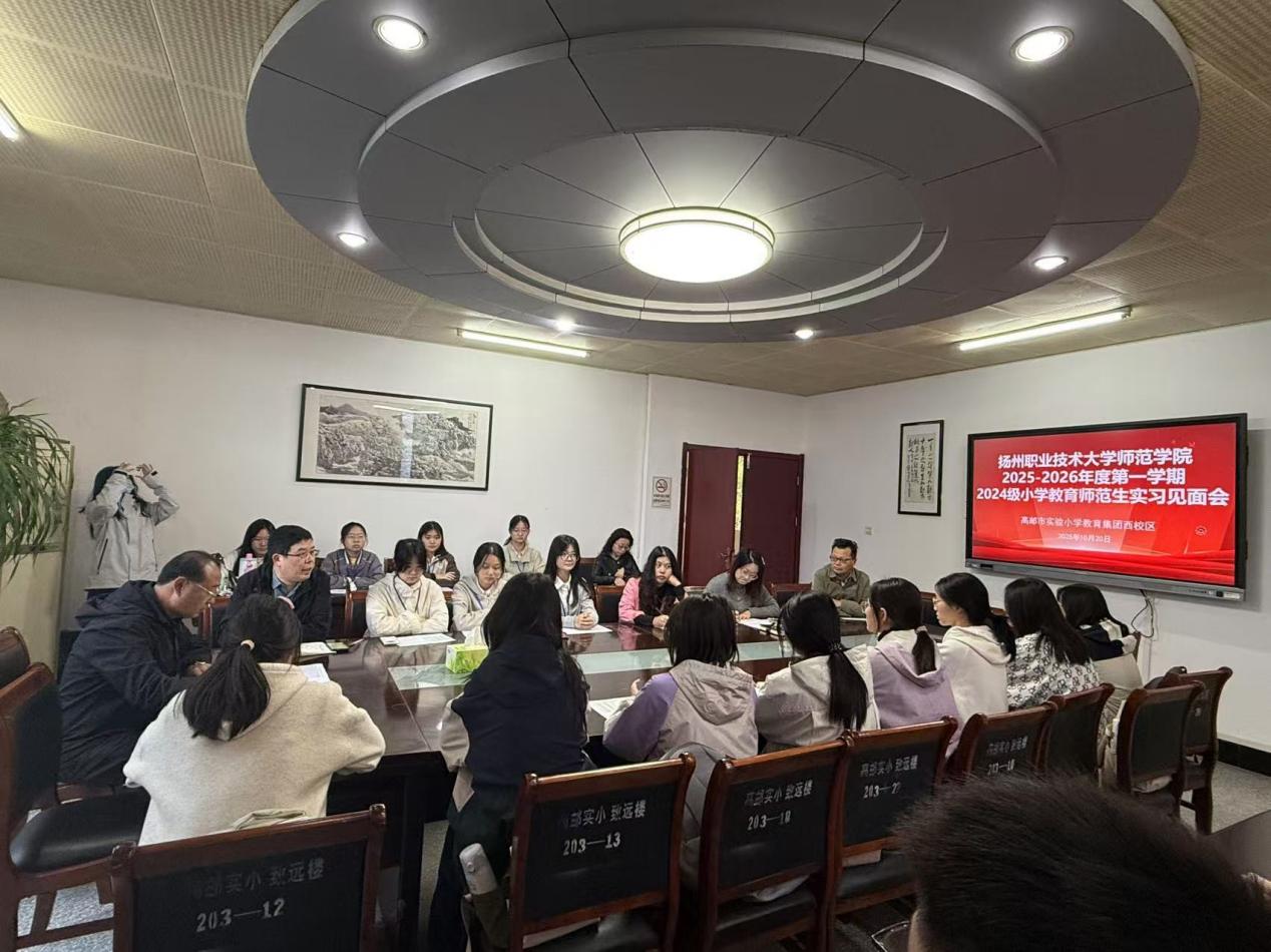 2025年10月20日,扬州职业技术大学小学教育专业定向师范生实习见面欢迎会在高邮市实验小学西校区举行。会议伊始,校长王国照介绍了高邮市实验小学办学理念、校园文化和教学特色。