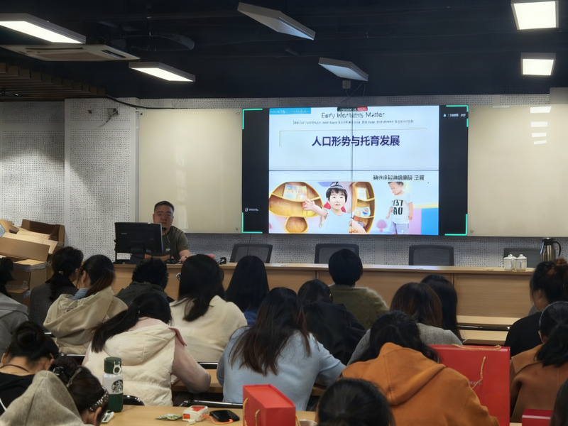 随后,扬州市妇幼保健院儿童保健科主任王磊作了题为《人口形势与托育发展》的专题报告。他从当前人口出生率变化及幼儿园招生现状切入,深入分析了托育行业面临的机遇与挑战。为积极应对市场趋势,他提出了一系列创新思路,例如探索“老幼同养”新模式,开设“计时制”托育班,以及提供全日制、半日托、计时托等灵活多样的服务形式,旨在通过人性化与多样化的服务供给,满足社会需求,增强机构自身的发展韧性与市场竞争力。