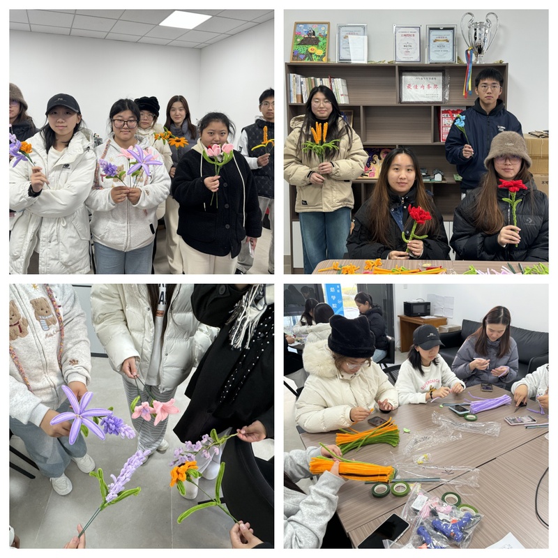 为缓解学习压力,增进团队情感联结,专题培训结束后,学院特别组织了扭扭棒手工制作的趣味团建活动。活动中,同学们相互协作,充分发挥想象力和创造力,五彩缤纷的扭扭棒在指尖缠绕、折叠、造型,逐渐变幻成一朵朵栩栩如生、独具匠心的手工花朵。活动现场气氛轻松愉悦,大家在手工制作中释放压力、增进感情,在交流合作中加深了彼此的了解与信任,进一步提升了团队的向心力和归属感。