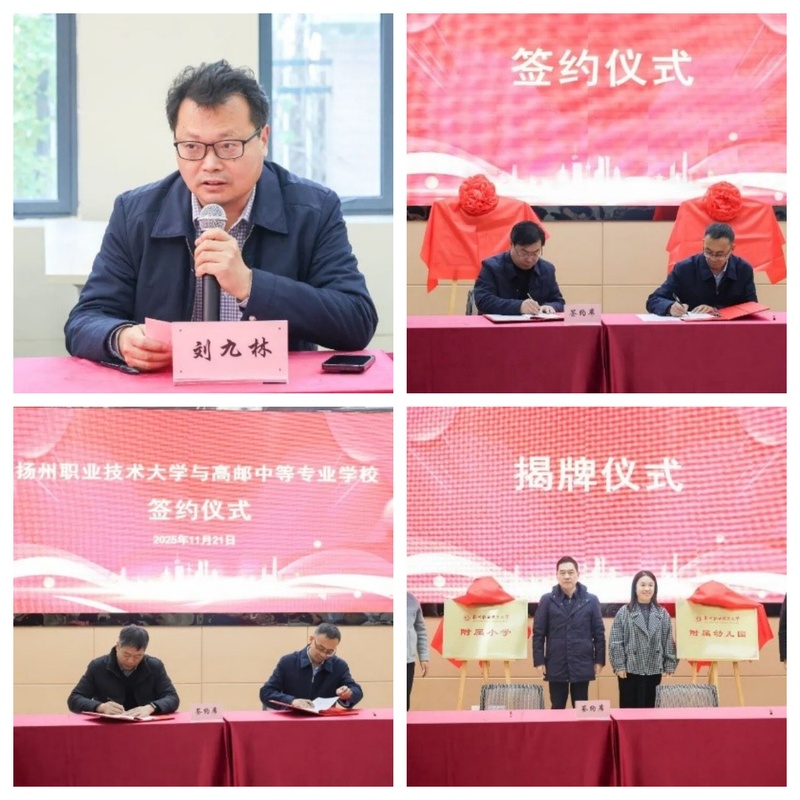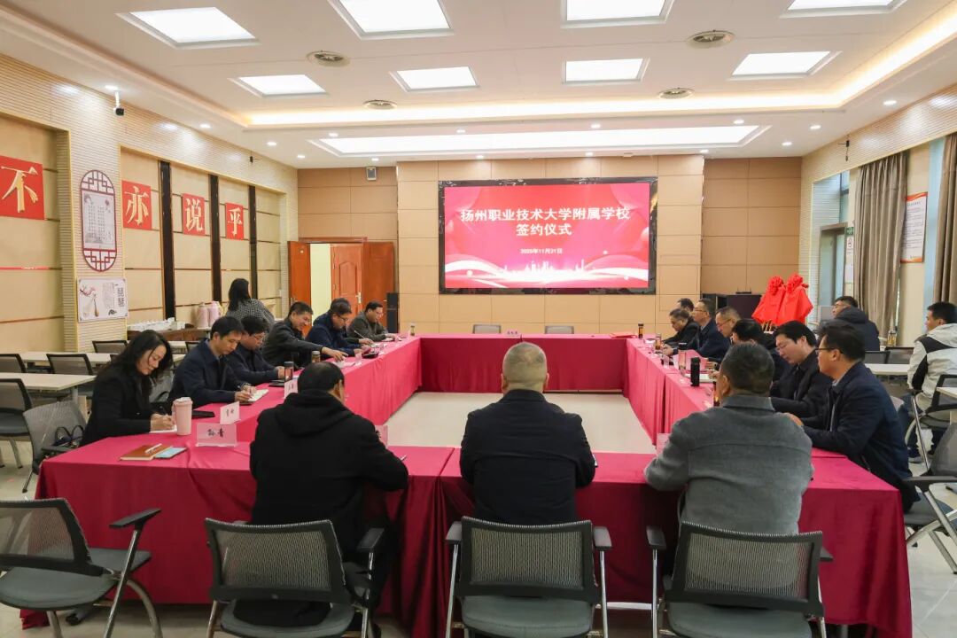 11月21日下午,扬州职业技术大学附属学校签约仪式在高邮实验小学南校区隆重举行。扬州职业技术大学党委副书记陈亚鸿、高邮市副市长周启泉出席签约仪式,我校教务处、发规处、师范学院等部门负责同志,高邮市政府办、市教体局、城南经济新区管委会以及实验小学教育集团等单位代表齐聚一堂,共同见证校地教育深度融合的重要时刻,开启合作崭新篇章。