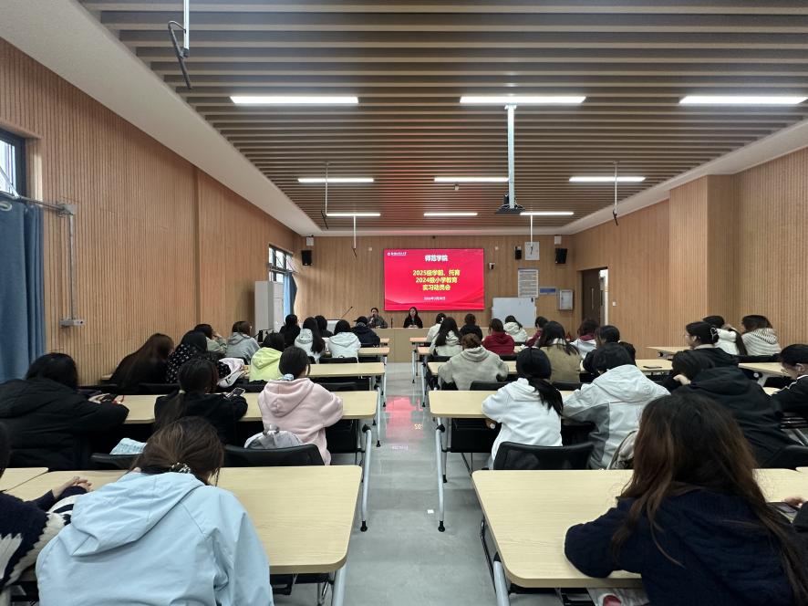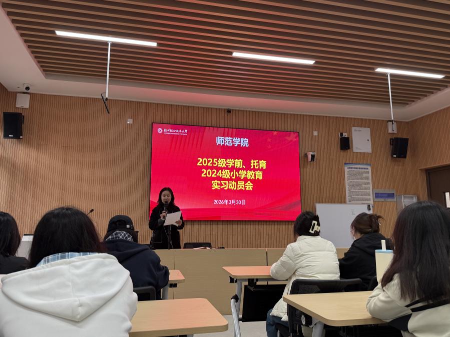 为有序推进25级学前、托育与24级小学教育专业为期1周的实习工作,助力学生实现从理论学习到实践技能学习做好过渡准备,2026年3月30日,师范学院在高邮湖校区师范楼A101教室召开实习动员大会,各系部主任、各班主任及全体实习生参会。